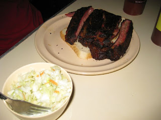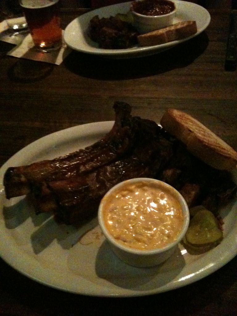 After bowling we were in the mood for some more barbeque, so we headed over to Arthur Bryant’s BBQ in downtown KC (just about 3-4 blocks south of the Gate’s BBQ location we ate at when first driving into town). Joel ordered the long ribs and Jeff ordered the pulled pork. Both were very amazing, but you can get a true feeling of the awesome with the ribs because you can try all 3 of their wonderful sauces (Rich Heat and Sweet Heat are particularly amazing) on them. Joel bought a bottle of the Rich Heat, though we have a feeling we’ll stop in tomorrow and buy another bottle of the Sweet Heat as well. Might even get another set of ribs while we’re there. So delicious.