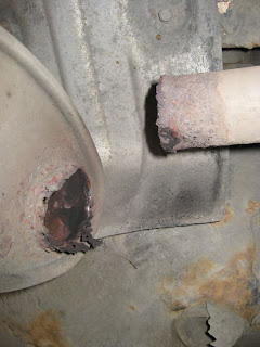 Having determined that the muffler (which had only been holding on with some almost rusted-through piping) had broken off of the exhaust pipe on Day 3, we decided to stop in at an Autozone and buy some sort of repair kit. After buying a kit that included some aluminized metal, hose clamps and muffler tape, along with some sheet metal snips and a small piece of 1.75” to 2” pipe we jacked up the car and “fixed” it.